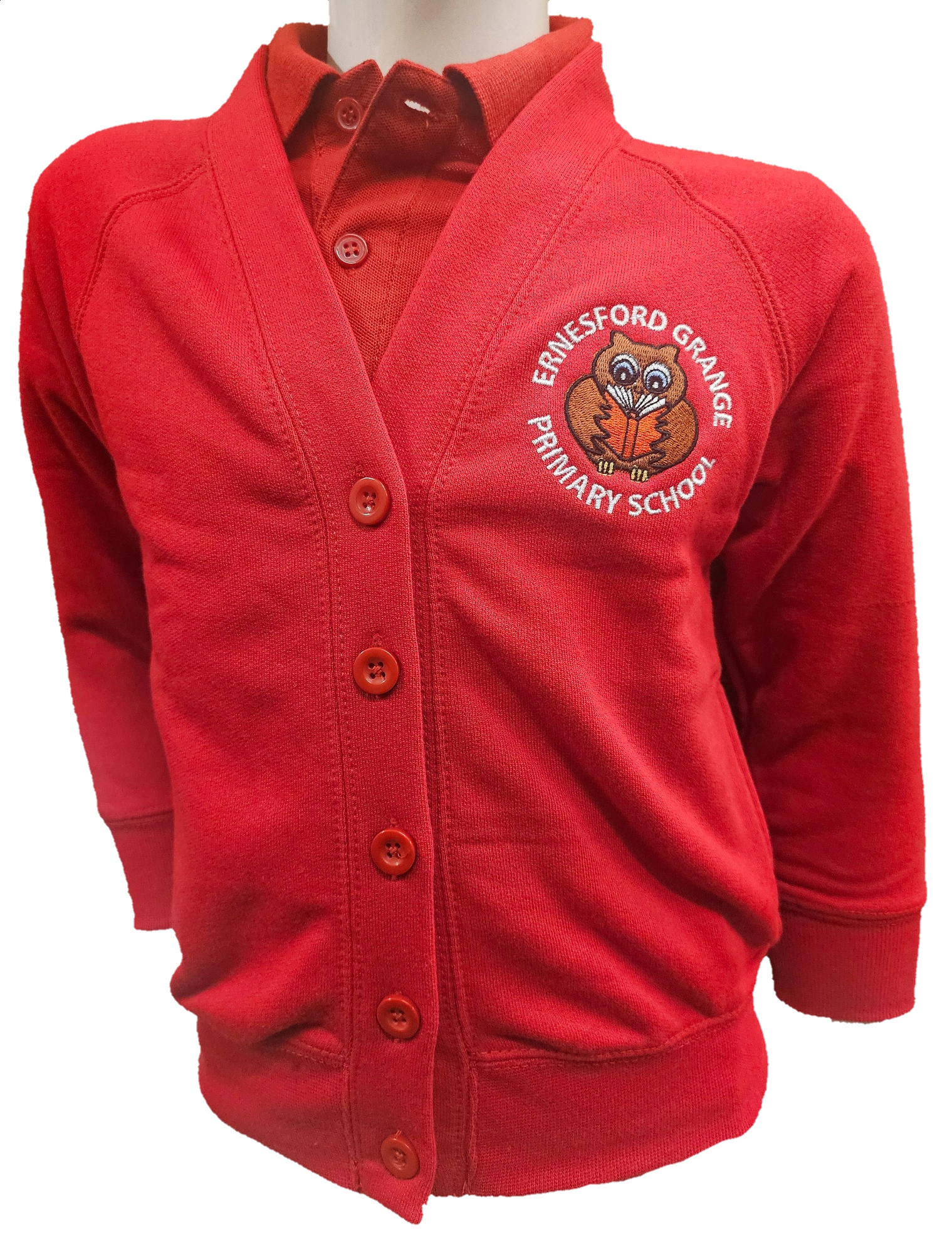 Red sweat-cardigan with Ernesford Grange Primary logo