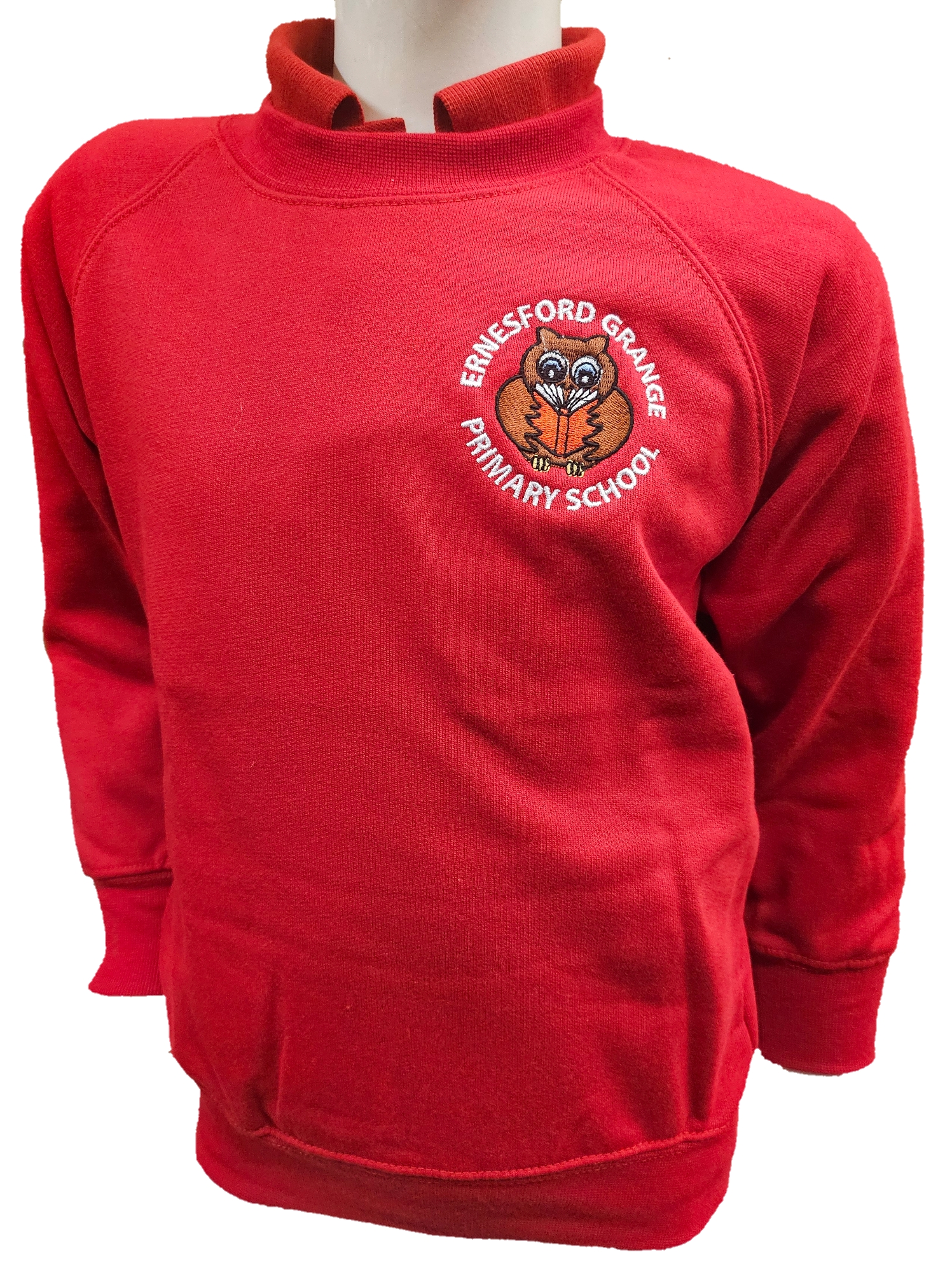 Red sweatshirt with Ernesford Grange Primary logo