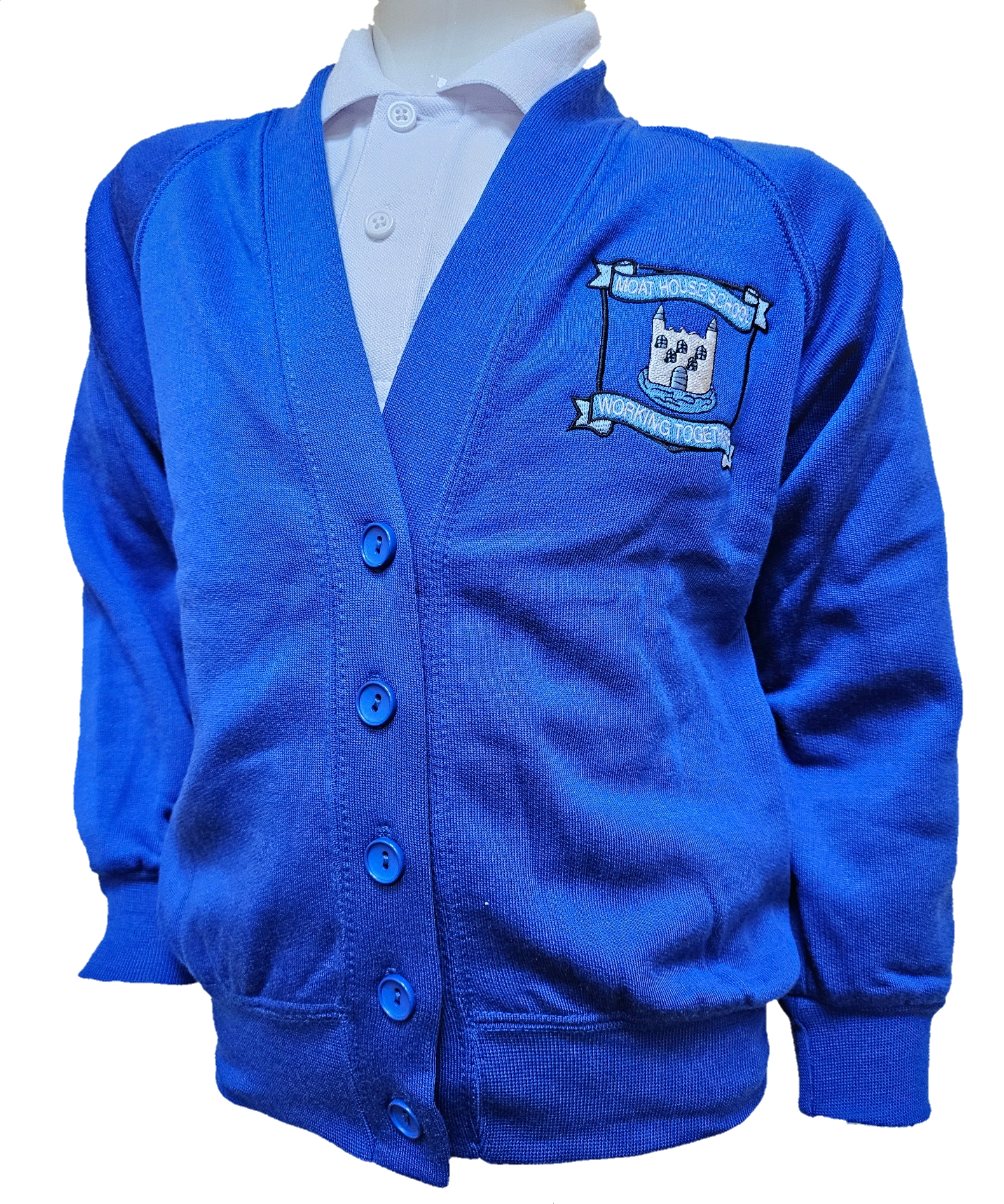 Ocean sweat cardigan with Moat House Logo V-neck with button front 45% Acrylic 30% Cotton 15% Polyester 10% Mixed Fibres